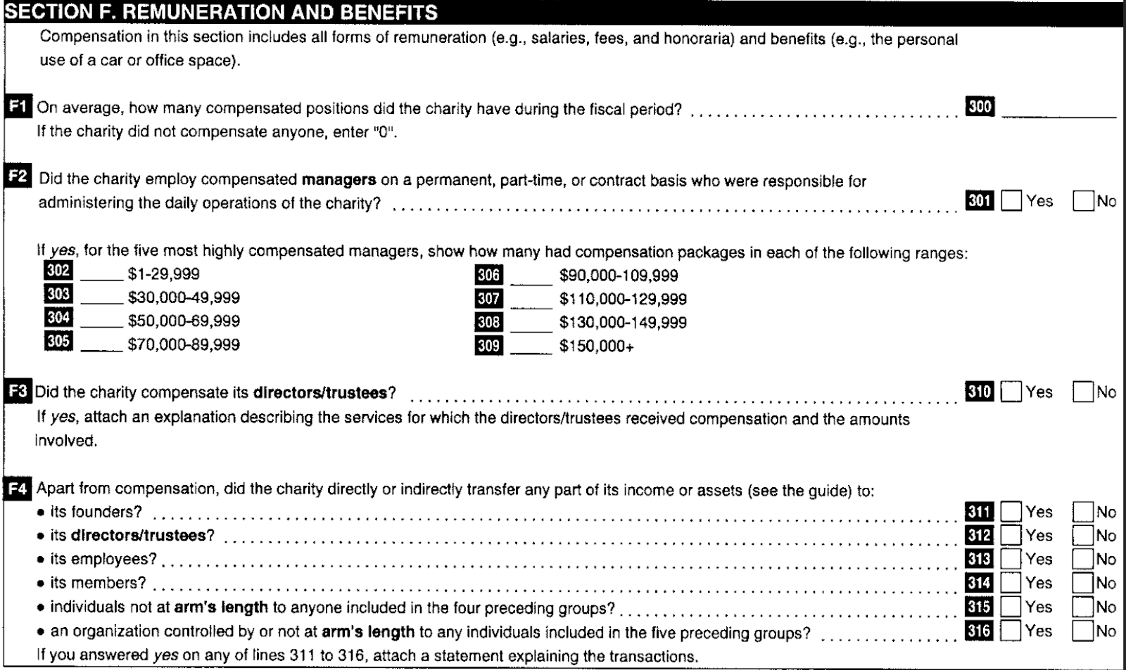 From 2009 to present, the form required charities to disclose the compensation range for the top 10 most highly compensated full-time staff, whereas previously only the top five were required.